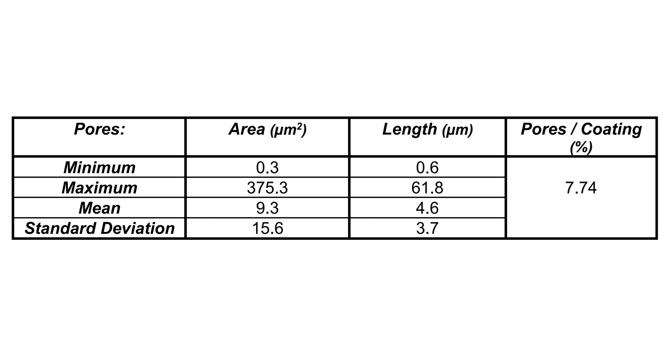Mit Clemex Vision PE werden die in der thermischen Beschichtung gefundenen Poren ermittelt, gemessen und statistisch aufbereitet. Die Ergebnisse werden in der Tabelle unten zusammengefasst. Klicken Sie unten auf der Seite auf "PDF herunterladen", um mehr Informationen über die Analyse zu erhalten.