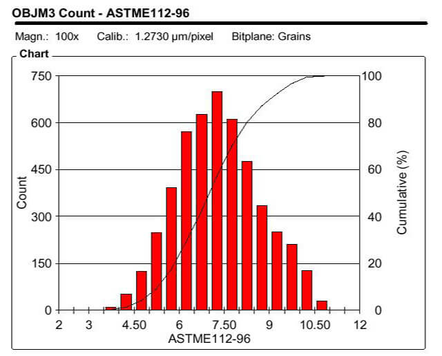 Es wurden ASTM E 112-Korngrößemessungen vorgenommen. Die Ergebnisse wurden für die Erstellung automatischer Statistiken und Diagramme zusammengefasst. Die abschließenden Ergebnisse können direkt über Clemex Vision ausgedruckt werden. Die Rohdaten sind mit ihren entsprechenden Objekten verknüpft und können in eine Excel-Datei exportiert werden. Bei der Analyse von Körnern ohne Kornzwillinge traten keine Probleme auf. Kornzwillinge wurden mittels halbautomatischem Prozess basierend auf der Heyn-Methode analysiert.