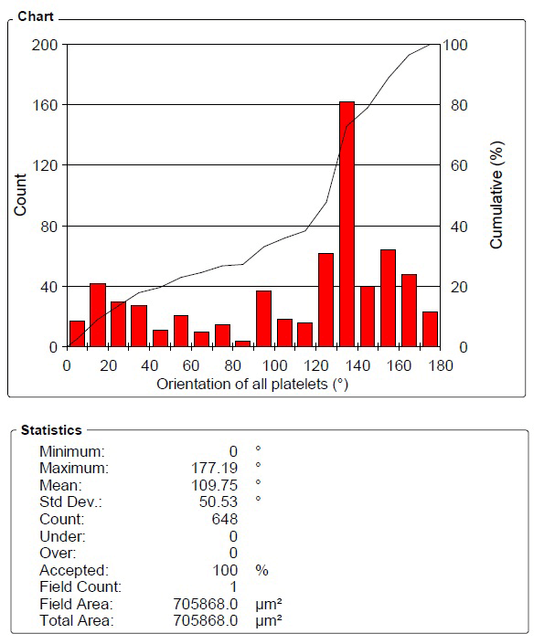 Die Orientierung aller Plättchen und der Anteil der Radialplättchen wird bestimmt. Die abschließenden Ergebnisse können direkt über Clemex Vision ausgedruckt werden. Rohdaten werden zur Auswertung mit den entsprechenden Objekten verknüpft. Die Rohdaten können auch in eine Excel-Datei exportiert werden.