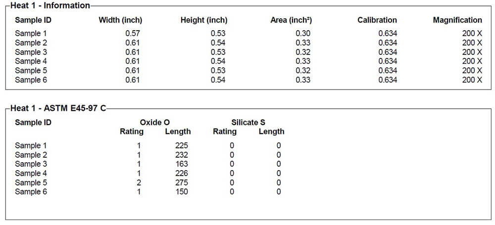 Das System kann auf bestimmte standardisierte Art auf die Ergebnisse zugreifen. Nach Abschluss der Analyse erscheint ein Ergebnisfenster und im Bildfenster erscheint eine Zuordnung der Einschlusskategorien für die aktuell ausgewählte Probe. Die schlechtesten Felder jeder Kategorie können bewertet werden. Wenn sich ein Einschluss über mehr als ein Feld erstreckt, rekonstruiert das CIR-System den kompletten Einschluss aus verschiedenen Teilen und berücksichtigt die gesamte Länge bei der Bewertung. Die Gesamtergebnisse finden Sie im angehängten Bericht.