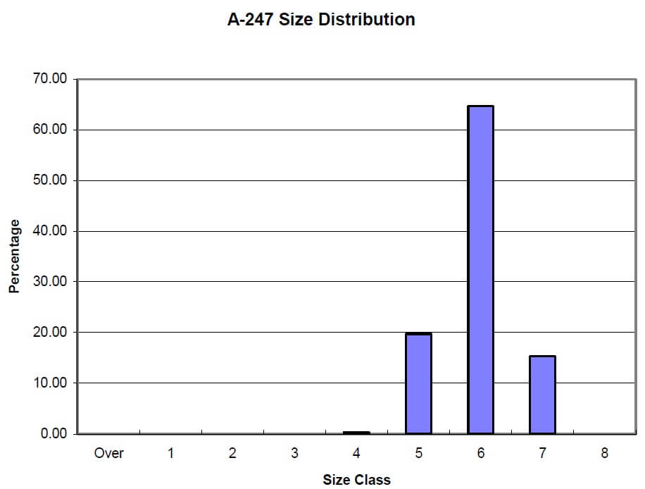 Die Messungen für jede einzelne Komponente erfolgten im Sichtfeld. Bei der Analyse mehrerer Bilder wurden automatisch Statistiken und Diagramme erstellt und zusammengefasst. Die abschließenden Ergebnisse können direkt über Clemex Vision ausgedruckt werden. Rohdaten werden zur Auswertung mit den entsprechenden Objekten verknüpft. Die Rohdaten können auch in eine Excel-Datei exportiert werden, um dort ein automatisches Makro zur Ermittlung der Größenklasse zu erstellen.