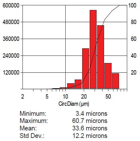 Für jede Komponente wurden Bereich, Länge, Kreisdurchmesser, Rundheit, Seitenverhältnis, Breite und Volumen gemessen. Statistiken und Diagramme wurden automatisch generiert. Die abschließenden Ergebnisse können direkt über Clemex Vision ausgedruckt werden. Rohdaten werden zur Auswertung mit den entsprechenden Objekten verknüpft. Die Rohdaten können auch in eine Excel-Datei exportiert werden. Die Gesamtergebnisse finden Sie im angehängten Bericht.