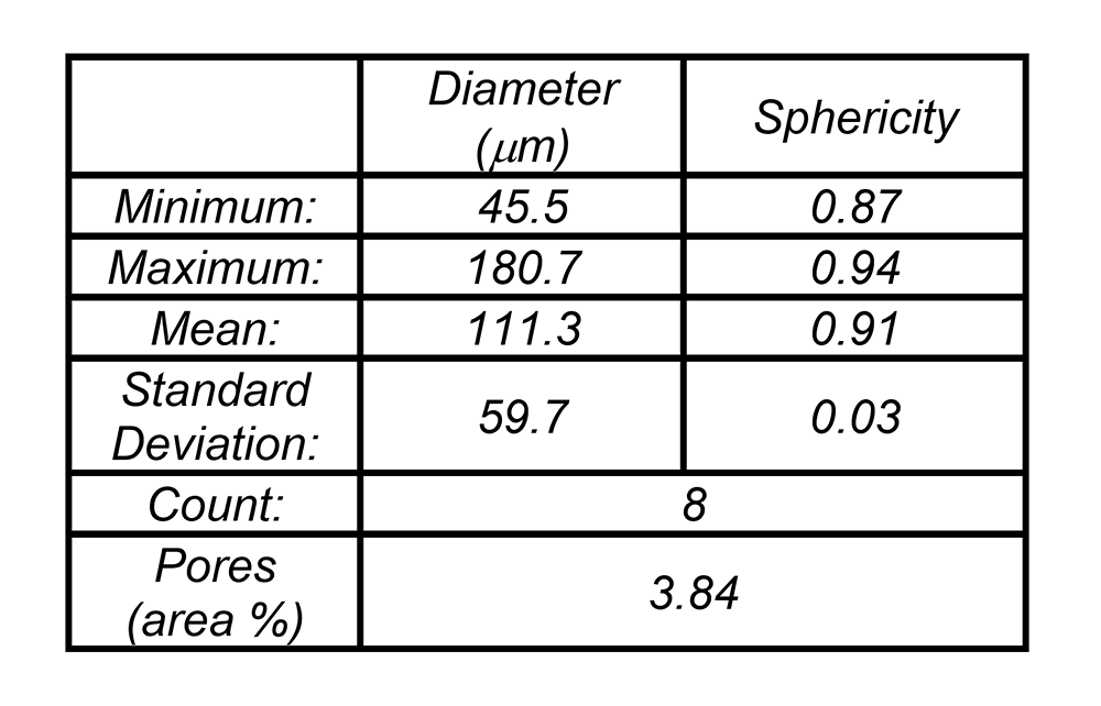 Bei der Analyse werden der Kreisdurchmesser und die Sphärizität der kompletten Kugeln sowie der Porenbereich gemessen. Die abschließenden Ergebnisse können direkt über Clemex Vision ausgedruckt werden. Rohdaten werden zur Auswertung mit den entsprechenden Objekten verknüpft. Die Rohdaten können auch in eine Excel-Datei exportiert werden.