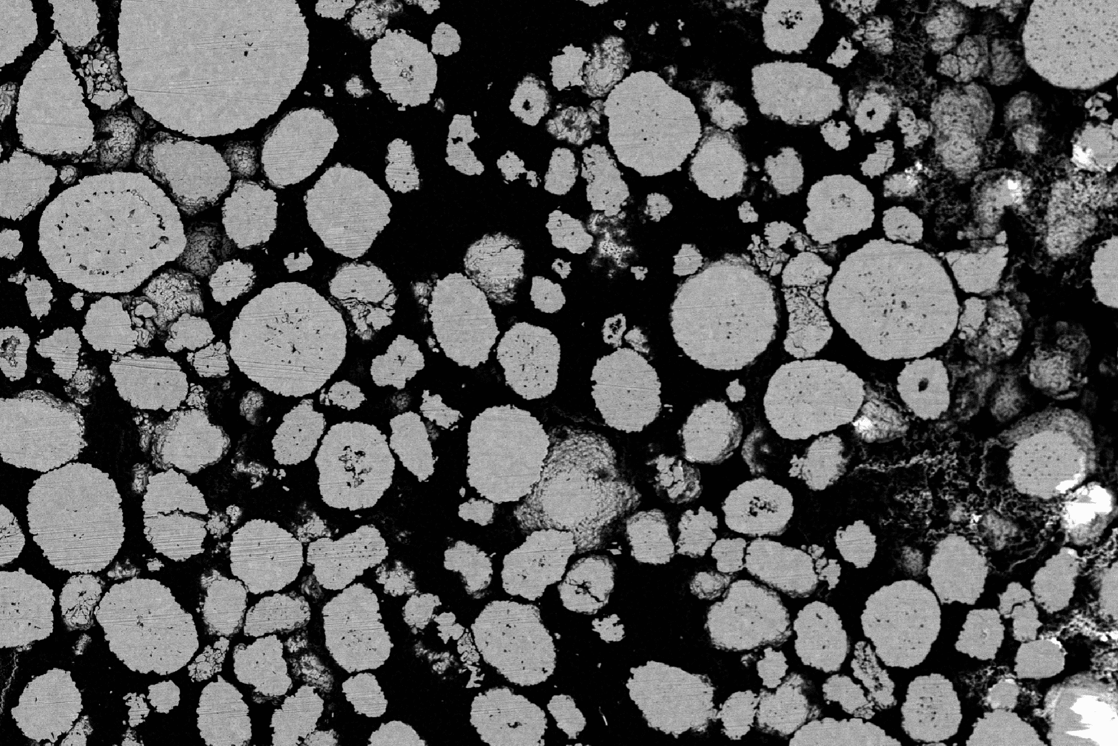 SEM-Bild eines Kathodenquerschnitts eines Lithium-Ionen-Akkus. Größe und Form der Partikel wurden anschließend mit Clemex Vision analysiert. Bildquelle: Dr. André Clausner.