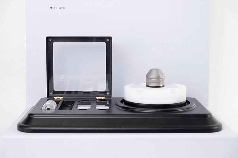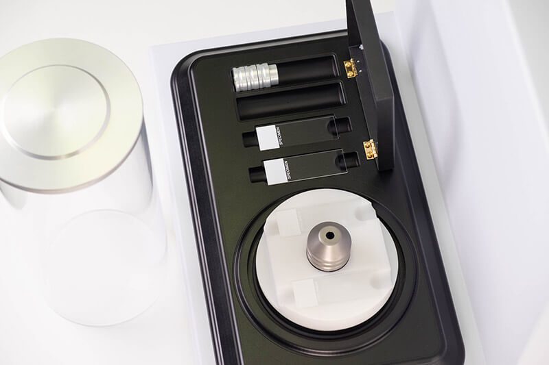 Wenn das Pulver in das Vakuumrohr eingebracht wird, fallen die Partikel langsam auf die Glasobjektträger auf beiden Seiten der Dispergierdüse. Sie sind dann nicht mehr gebündelt oder geclustert und können besser betrachtet werden.
