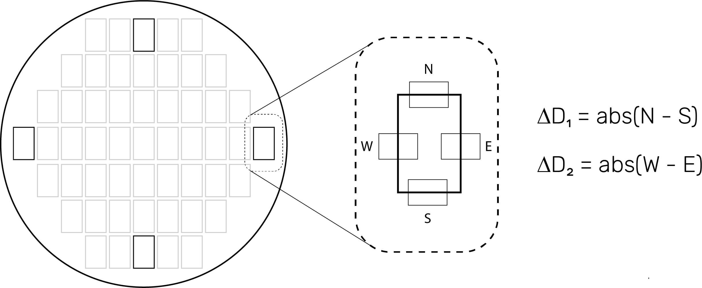 Um den gemittelten Gesamtabstand zu erhalten, wird der absolute Abstand der oberen Kante des Dies von dem der unteren Kante subtrahiert, um eine Differenz der Abstände zu erhalten: ΔD1. Dies wird für die rechte und linke Kante wiederholt, um den ΔD2-Wert zu ermitteln. Am besten sind ΔD-Werte nahe 0 mit Toleranzen, die einen Pass/Fail-Schwellenwert bilden.