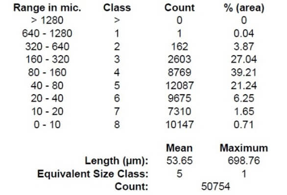 Die Messungen für jede einzelne Komponente erfolgten im Sichtfeld. Bei der Analyse mehrerer Bilder wurden automatisch Statistiken und Diagramme erstellt und zusammengefasst. Die abschließenden Ergebnisse können direkt über Clemex Vision ausgedruckt werden. Rohdaten werden zur Auswertung mit den entsprechenden Objekten verknüpft. Die Rohdaten können auch in eine Excel-Datei exportiert werden, um dort ein automatisches Makro zur Ermittlung der Größenklasse zu erstellen.