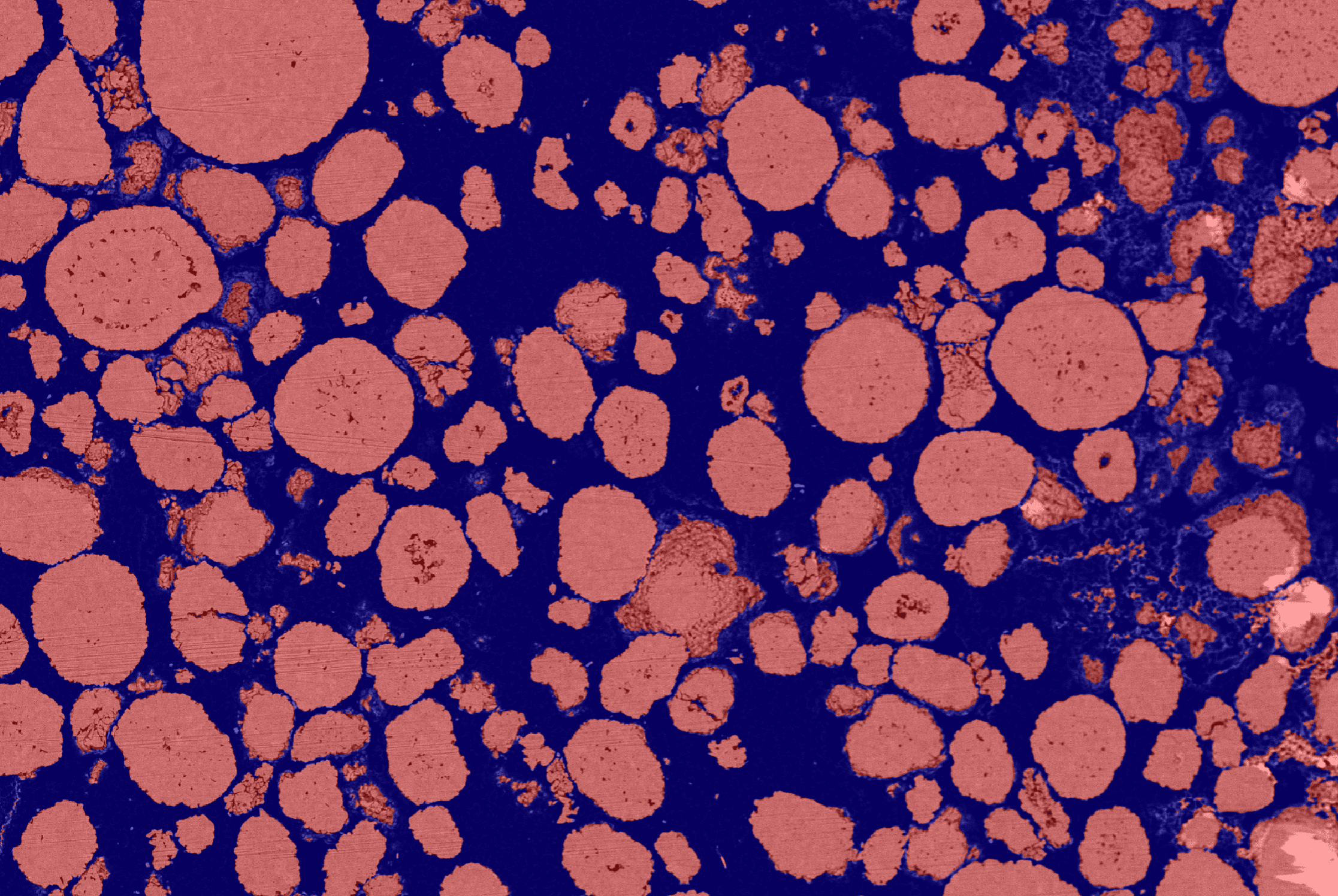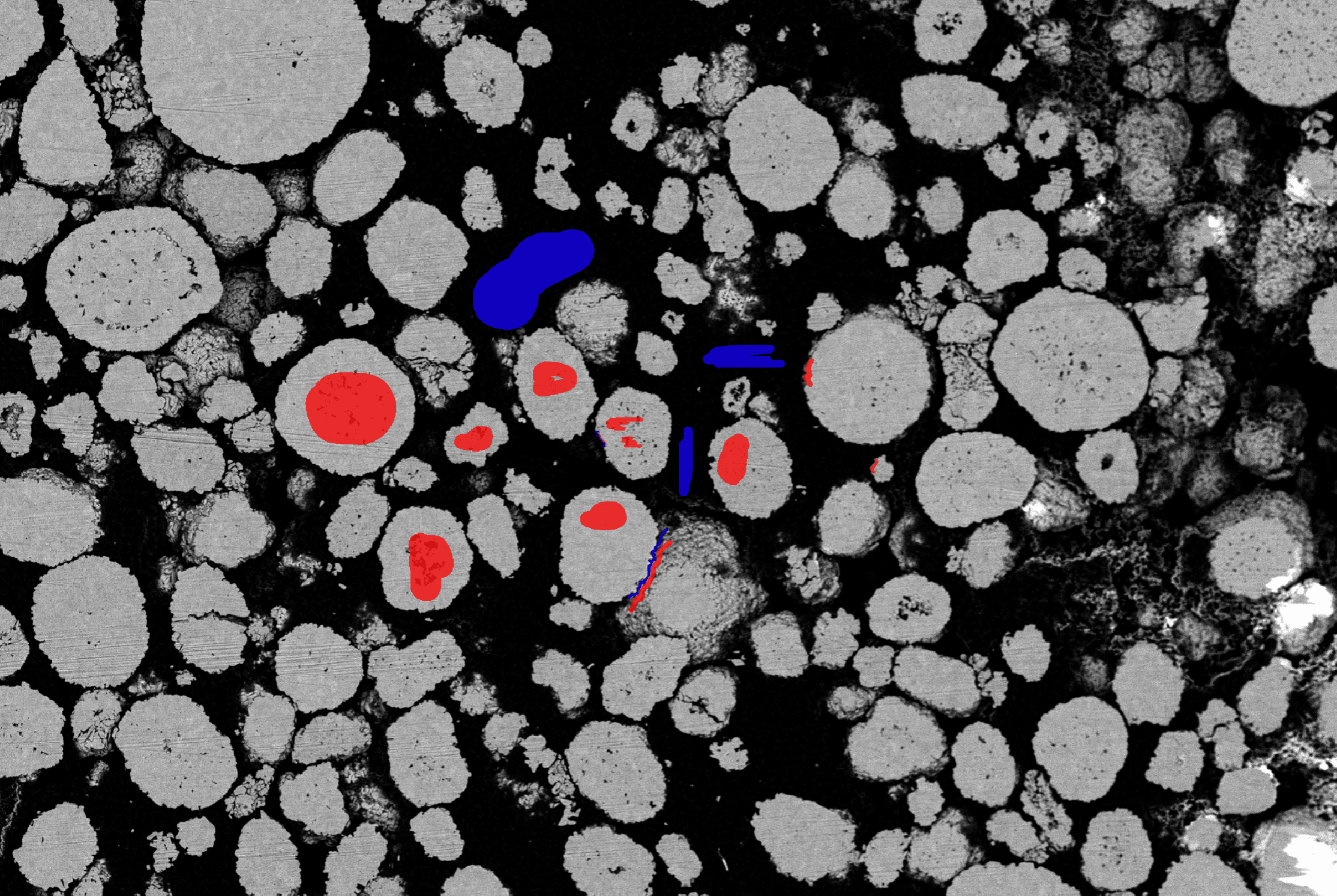 Mineralpartikel im Harz. Hier bestand die Herausforderung darin, den Hintergrund der Mineralpartikel-Cluster zu segmentieren. Bildquelle: Benjamin De Castro.