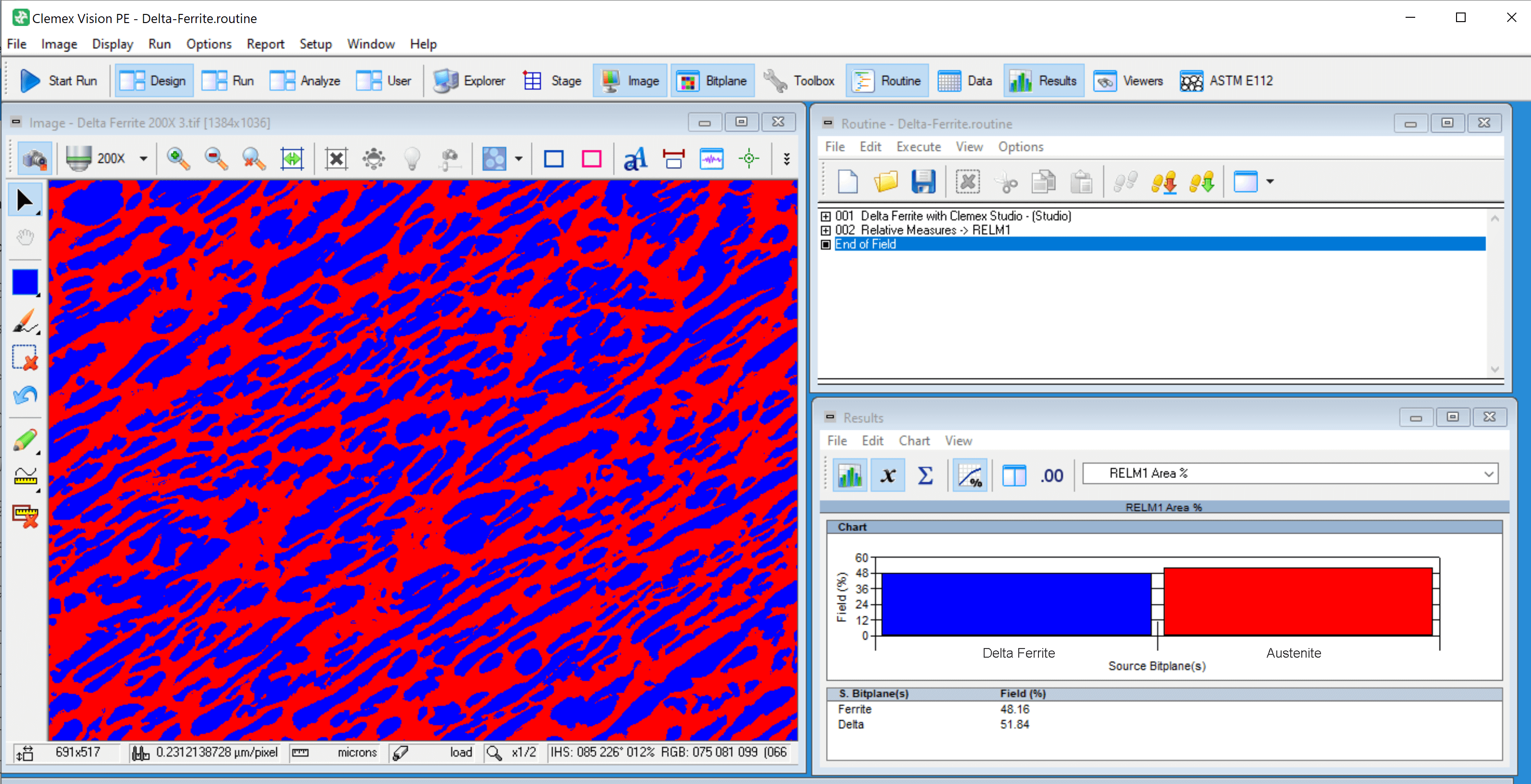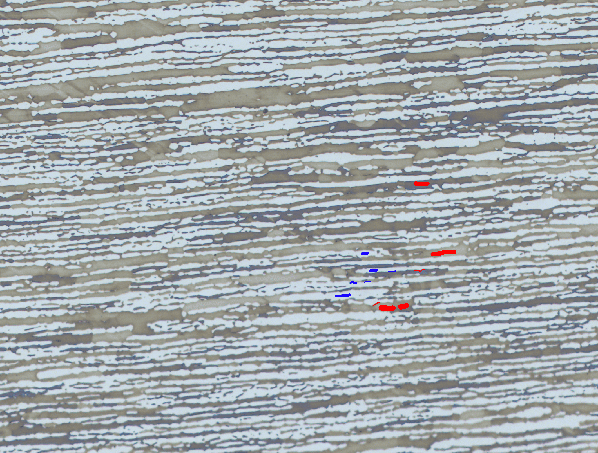 Deltaferrit ist eine gängige Phase in austenitischem Edelstahl. Die Ätzung dieses korrosionsbeständigen Materials ist manchmal schwierig, und die daraus resultierenden Phasen werden oft durch die Darstellung verschiedener Intensitäten (Flecken) beeinflusst, wodurch die Anwendung herkömmlicher Schwellenwerte erschwert wird. Mit dem trainierbaren Algorithmus von Clemex Studio können Sie ganz einfach den Anteil an Deltaferrit/Austenit und Sigma-Phase (falls vorhanden) ermitteln.