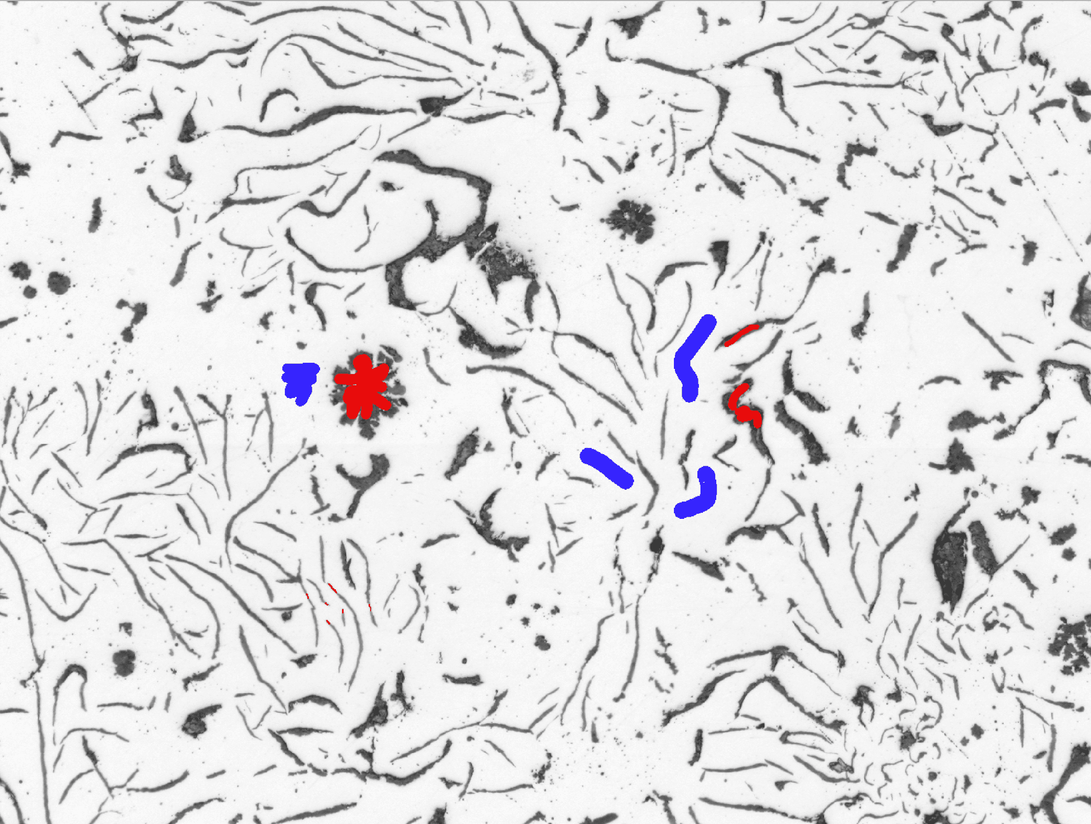 Späne sind ein Nodularitätsdefekt. Während der Magnesiumbehandlung werden Späne in Nodule umgewandelt. Eventuell verbliebene Späne werden als Fehler betrachtet. Ein angemessenes Antrainieren des Clemex Studio-Algorithmus hat sich bei der automatischen Erkennung von Nodulen und Spänen als erfolgreich erwiesen, um genaue Ergebnisse zur Nodularität zu erhalten. Die Messungen werden mit Clemex Vision durchgeführt.