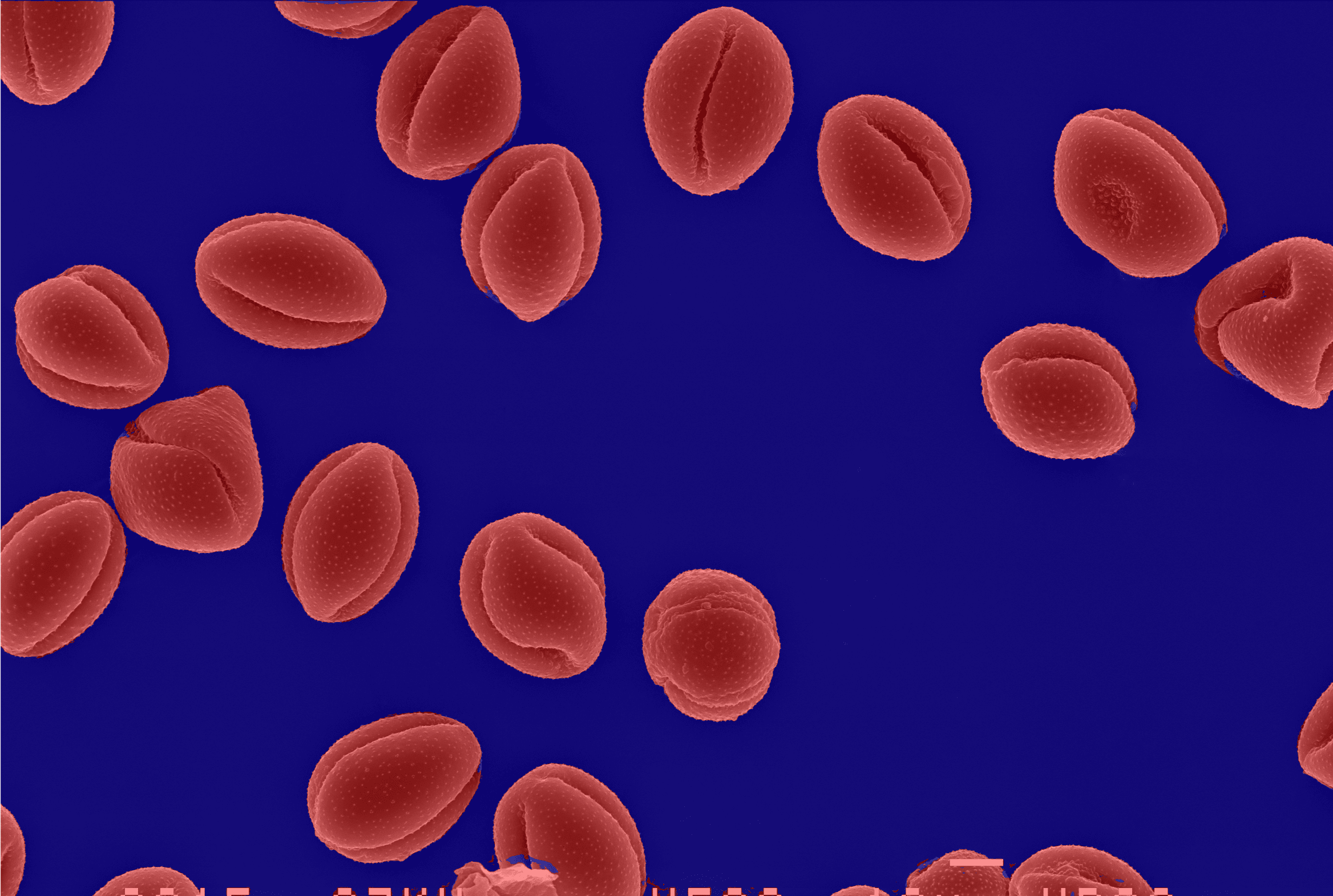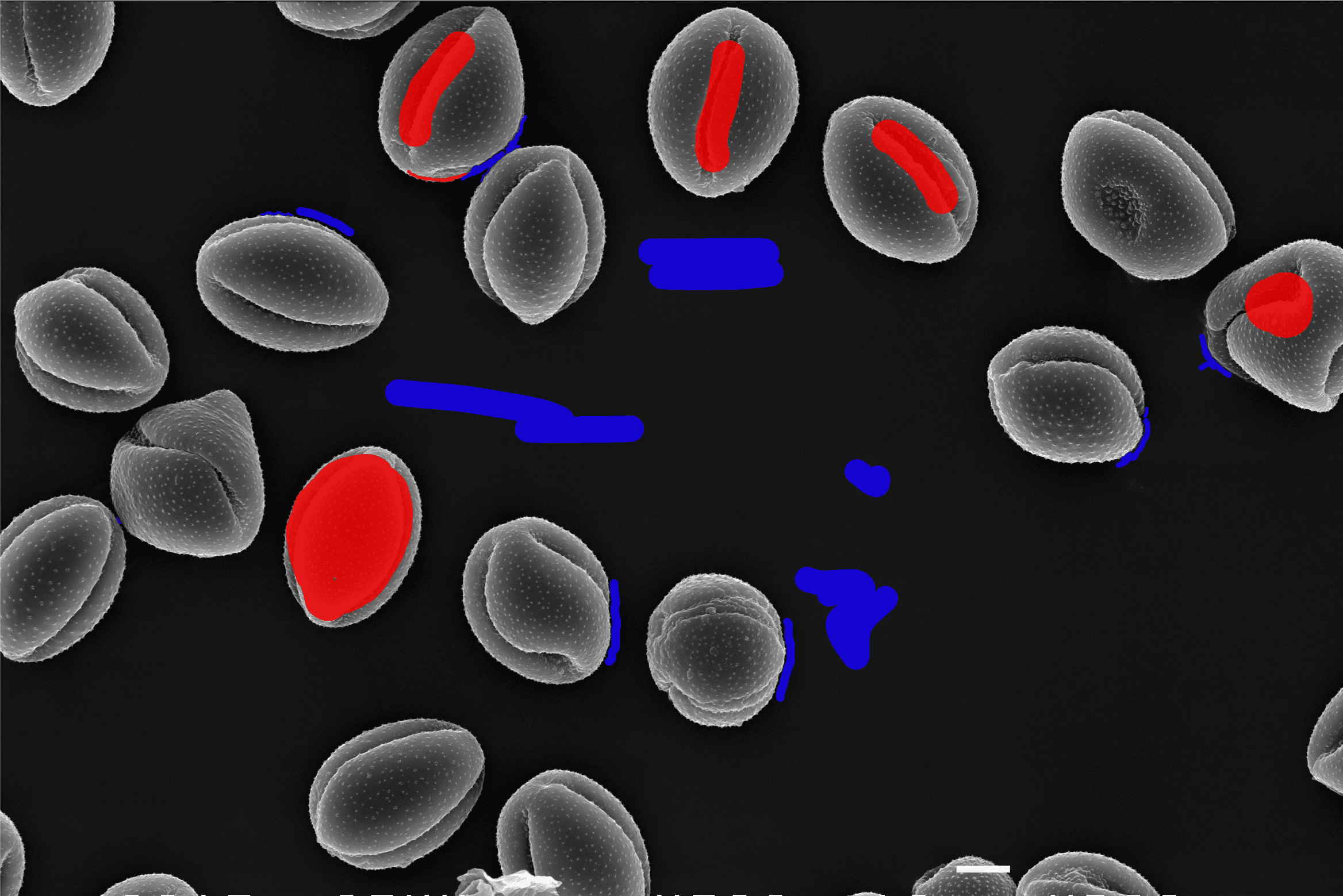 SEM-Bild von Pollen bei 500-facher Vergrößerung. Das Trainieren des Algorithmus erfolgte mit nur einem Bild und war sehr effizient.