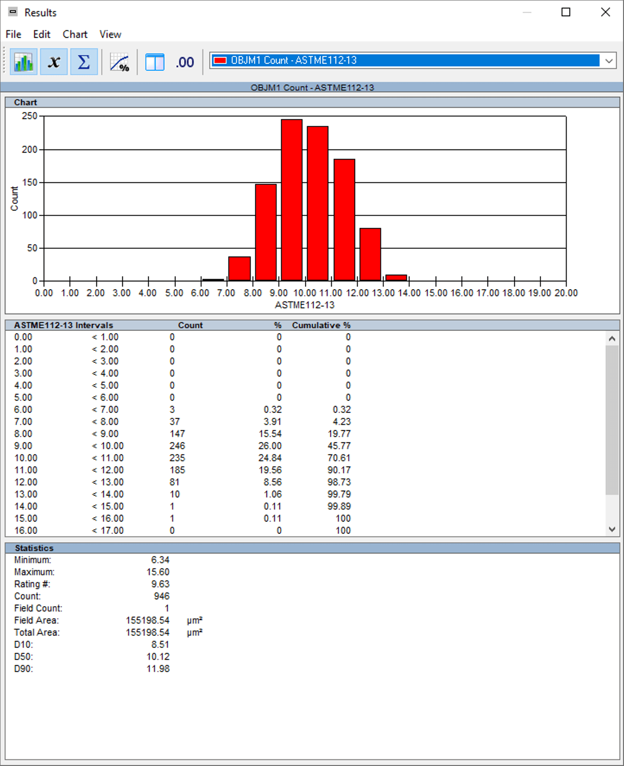Es werden Messungen der Zeilenstruktur nach ASTM E1258 und der Korngröße nach ASTM E112 durchgeführt. Die Ergebnisse wurden für die Erstellung automatischer Statistiken und Diagramme zusammengefasst. Die abschließenden Ergebnisse können direkt über Clemex Vision ausgedruckt werden. Die Rohdaten sind mit ihren entsprechenden Objekten verknüpft und können in eine Excel-Datei exportiert werden.