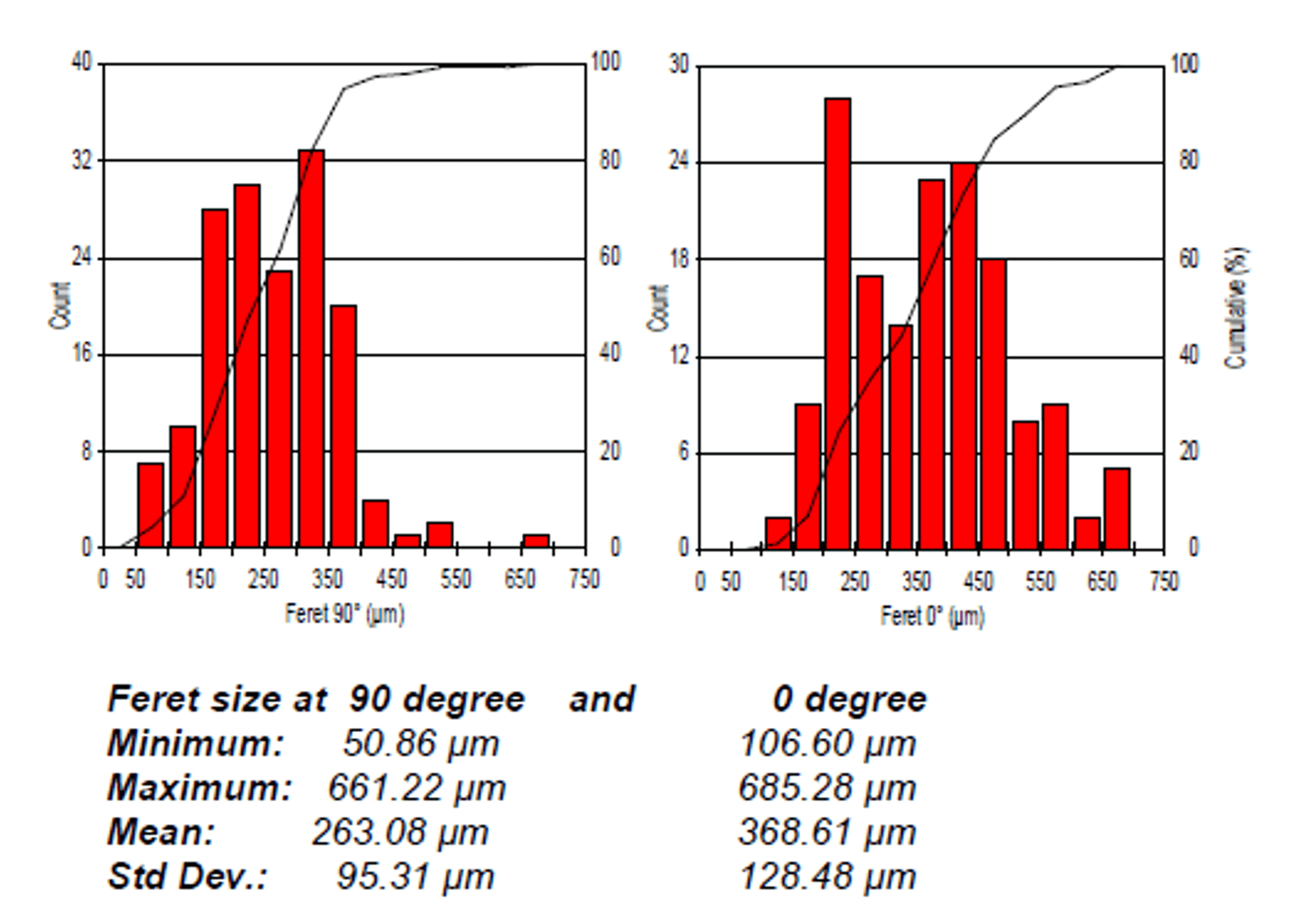 Für jede Komponente werden Bereich, Länge, Feret-Durchschnitt, Feret 0°, Feret 45°, Feret 90°, Feret 135°, Kreisdurchmesser, Seitenverhältnis und Ausrichtung gemessen. Für jedes Feld wird die Anisotropie berechnet. Bei der Analyse mehrerer Bilder (Proben) wurden automatisch Statistiken und Diagramme erstellt und zusammengefasst. Die abschließenden Ergebnisse können direkt über Clemex Vision ausgedruckt werden. Rohdaten werden zur Auswertung mit den entsprechenden Objekten verknüpft. Die Rohdaten können auch in eine Excel-Datei exportiert werden.