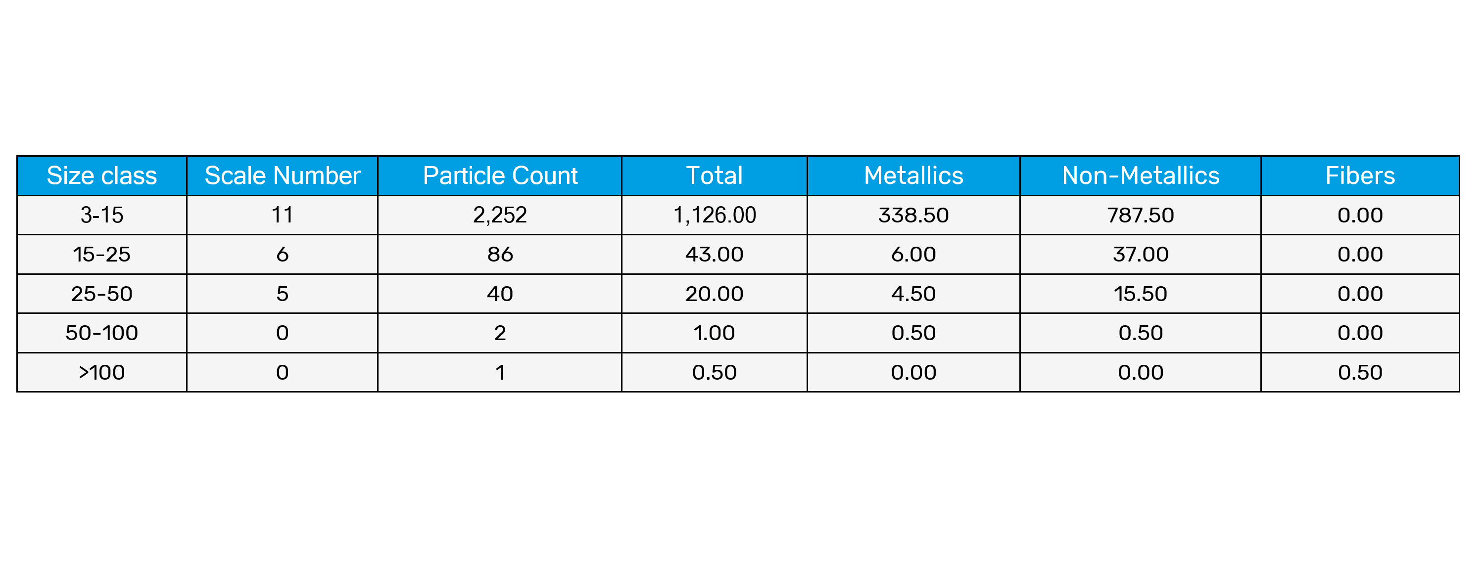 Bei der Analyse wurde der gesamte Filterbereich untersucht. Die Größe der verschiedenen Partikel wurde gemäß ISO 4406 und 4407 gemessen und klassifiziert.  Die abschließenden Ergebnisse können direkt über Clemex Contaminants ausgedruckt werden. Rohdaten können in eine Excel-Datei exportiert werden.