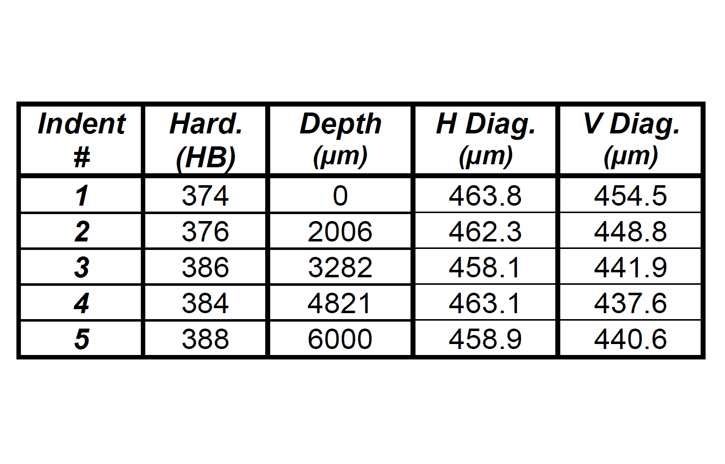 Die Prüfungen wurden an den 5 Eindringungen drei Mal wiederholt. Die durchschnittliche Brinell-Härte in der Mitte des Materials beträgt ca. 382 HB. Die abschließenden Ergebnisse können direkt über Clemex CMT ausgedruckt werden. Rohdaten können in eine Excel-Datei exportiert werden.