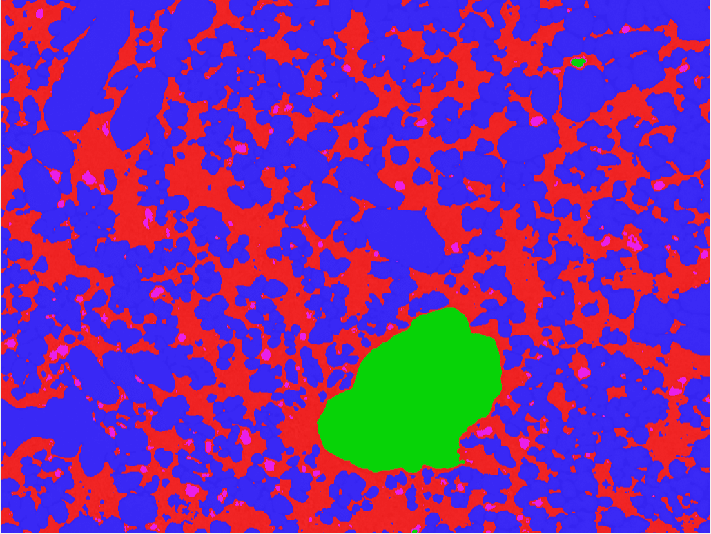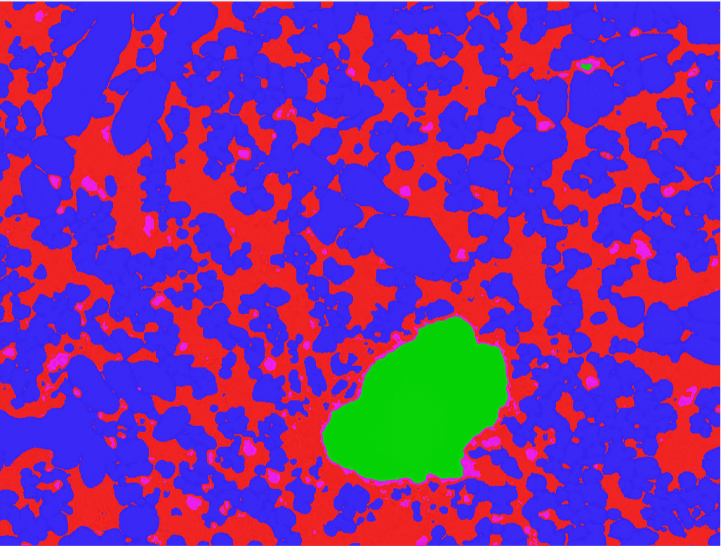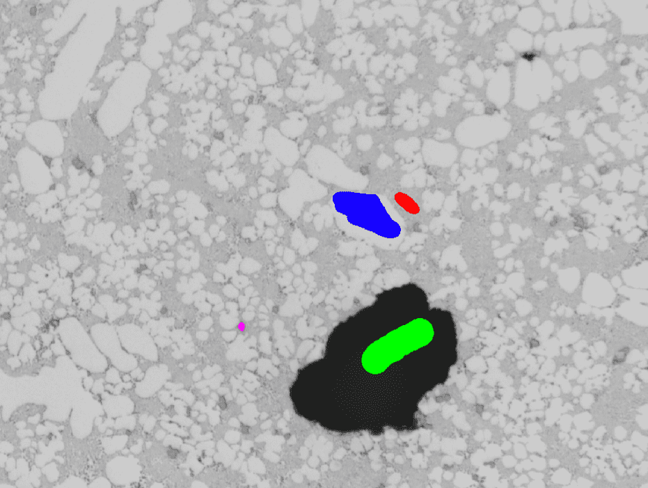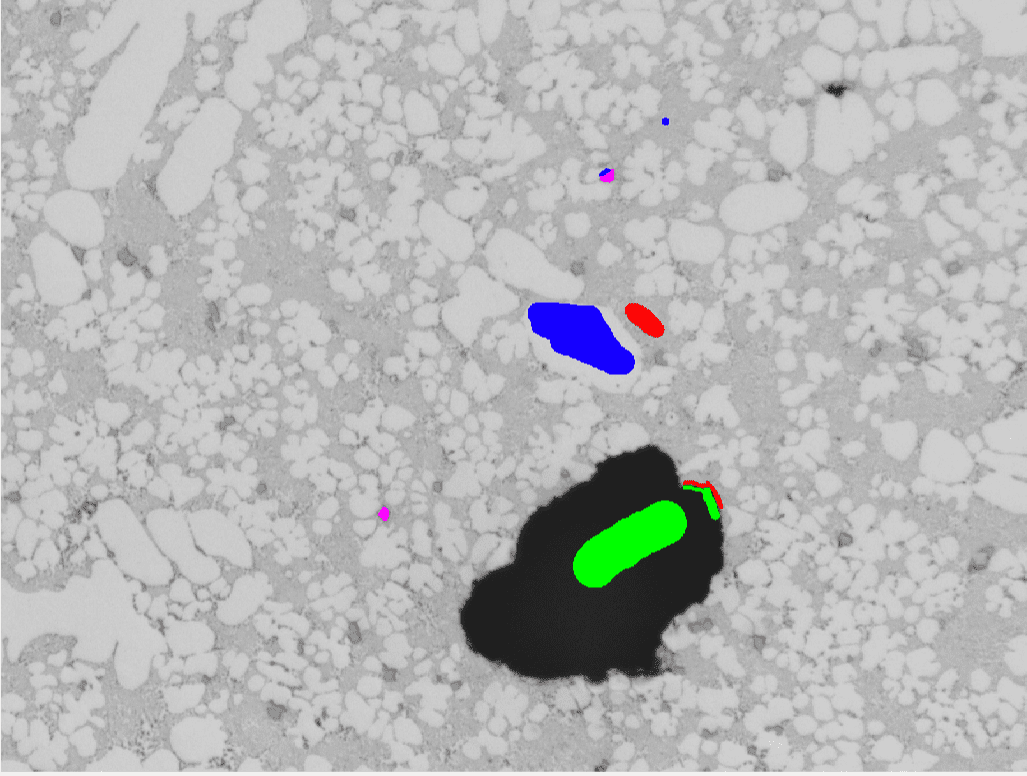 Die Komplexität eines solchen Workflows hängt hauptsächlich vom Bildsegmentierungsschritt ab. Bei der Segmentierung werden Bildpixel gesucht und ihnen wird eine Bedeutung zugewiesen. In der Metallographie bedeutet dies, dass jedem Pixel eine Klasse zugewiesen wird, z. B. Eutektikum, Porosität, Korngrenze oder andere signifikante Strukturen.
