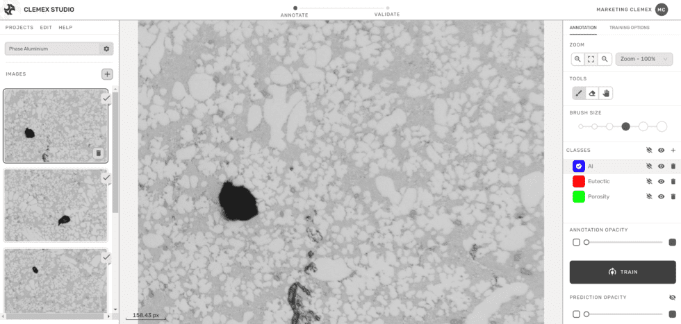 Der Anmerkungs-Workflow von Clemex Studio funktioniert intuitiv. Betrachten Sie das obige Bild einer Aluminiumlegierung, bei dem der Großteil von Al, eutektischen Strukturen, intermetallischen Phasen und Poren einfach mit nur einer Anmerkung für jedes Merkmal annotiert werden kann. Anschließend können Anmerkungen verstärkt werden, indem Merkmale in der Nähe des Bereichs der Phasengrenzen hervorgehoben werden. Die angrenzenden Merkmale können mit nur vier zusätzlichen Anmerkungen genau klassifiziert werden.