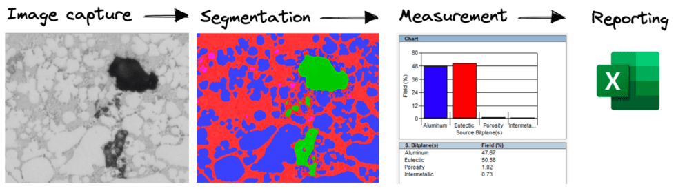 Eine erhebliche Hürde für Metallurgen beim Bestreben, ihren Bildanalyse-Workflow zu automatisieren, ist die Komplexität solcher Workflows. Die Erfahrung, die erforderlich ist, um benutzerdefinierte Bildanalyseroutinen zu verstehen und zu erstellen, geht in der Regel über den Leistungsumfang der meisten QS-Labore in einem Produktionskontext hinaus. Die folgende Abbildung zeigt typische Schritte eines Bildanalyse-Workflows, dargestellt anhand von mikroskopischen Aufnahmen einer Aural 2 Aluminiumlegierung von Rio Tinto, bei denen der Anteil von Aluminium, eutektischen Strukturen, Porosität und intermetallischer Phase extrahiert wird.