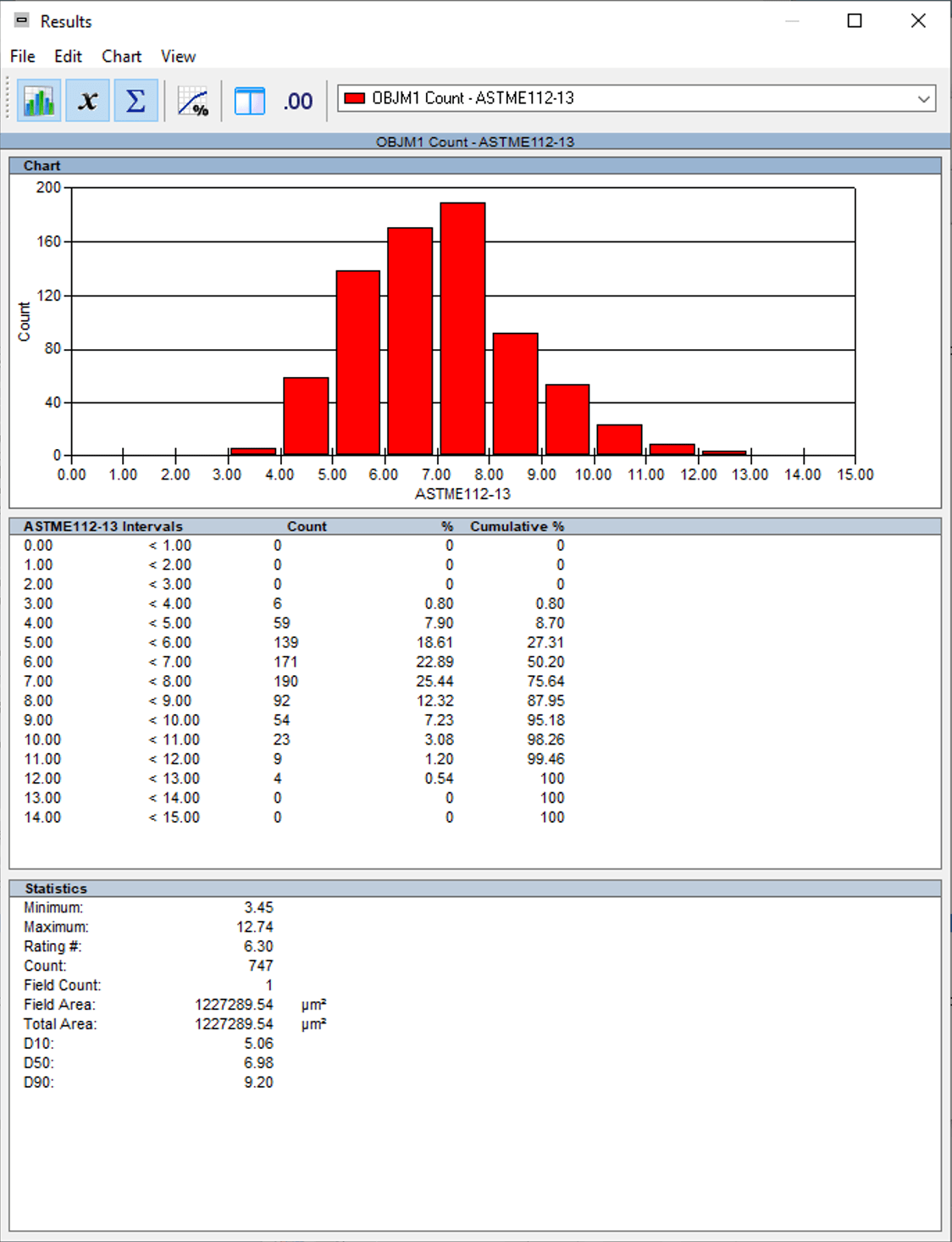 Les mesures de taille du grain ASTM E112 sont effectuées. Les résultats sont cumulés pour la génération automatique de statistiques et de graphiques. Les résultats finaux peuvent être imprimés directement à partir de Clemex Vision. Les données brutes sont liées à leurs objets respectifs et peuvent être exportées au format Excel.