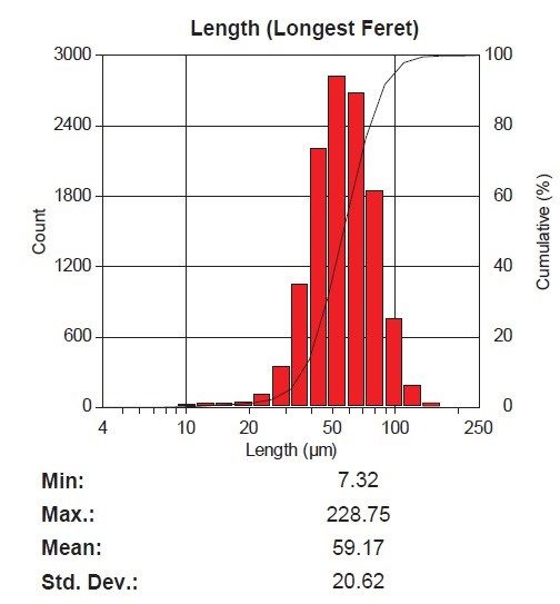La longueur, le diamètre circulaire, le rapport d’aspect, la sphéricité et la rugosité ont été mesurés sur les particules de chaque champ. Des statistiques et des graphiques automatisés ont été générés et présentés en annexe. Les résultats finaux peuvent être imprimés directement à partir de Clemex Vision. Les données brutes sont liées à leurs objets respectifs à des fins de validation. Les données brutes peuvent également être exportées au format Excel. Les résultats complets se trouvent dans le rapport joint.