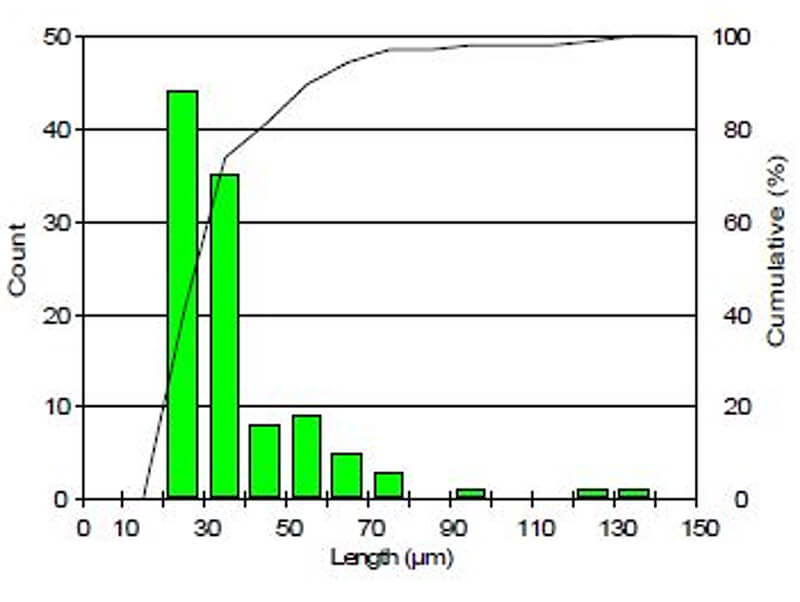 Les mesures de longueur sont effectuées uniquement sur des particules de plus de 25 microns. Un cadre protecteur est utilisé afin d’éviter une mesure erronée des éléments segmentés par le champ de vision. Les résultats ont été cumulés pour la production automatique de statistiques et de graphiques. Les résultats finaux peuvent être imprimés directement à partir de Clemex Vision. Les données brutes peuvent être exportées au format Excel.