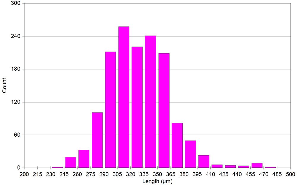 L’analyse de la distribution de la longueur des oxydes exigeait que seul l’Inconel soit visible dans le champ de vision. L’agrandissement utilisé était 100X (0,9810 µm/pixel). Ceci était suffisant pour détecter des objets aussi fins que 1 ou 2 microns. Une instruction Chord Size a été utilisée pour exclure les petits objets qui ne doivent pas être pris en compte dans l’analyse.