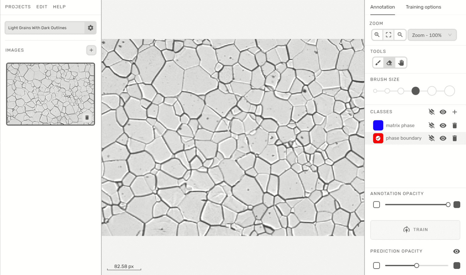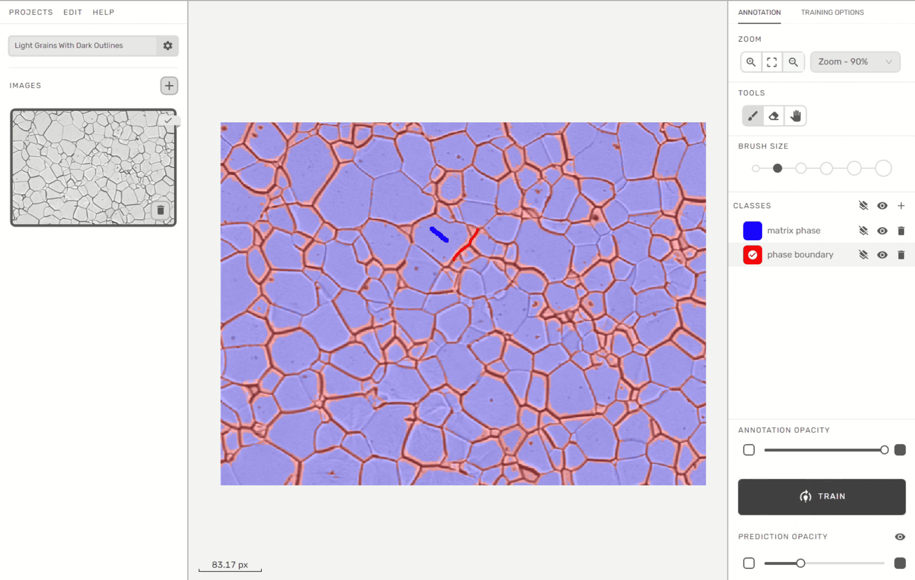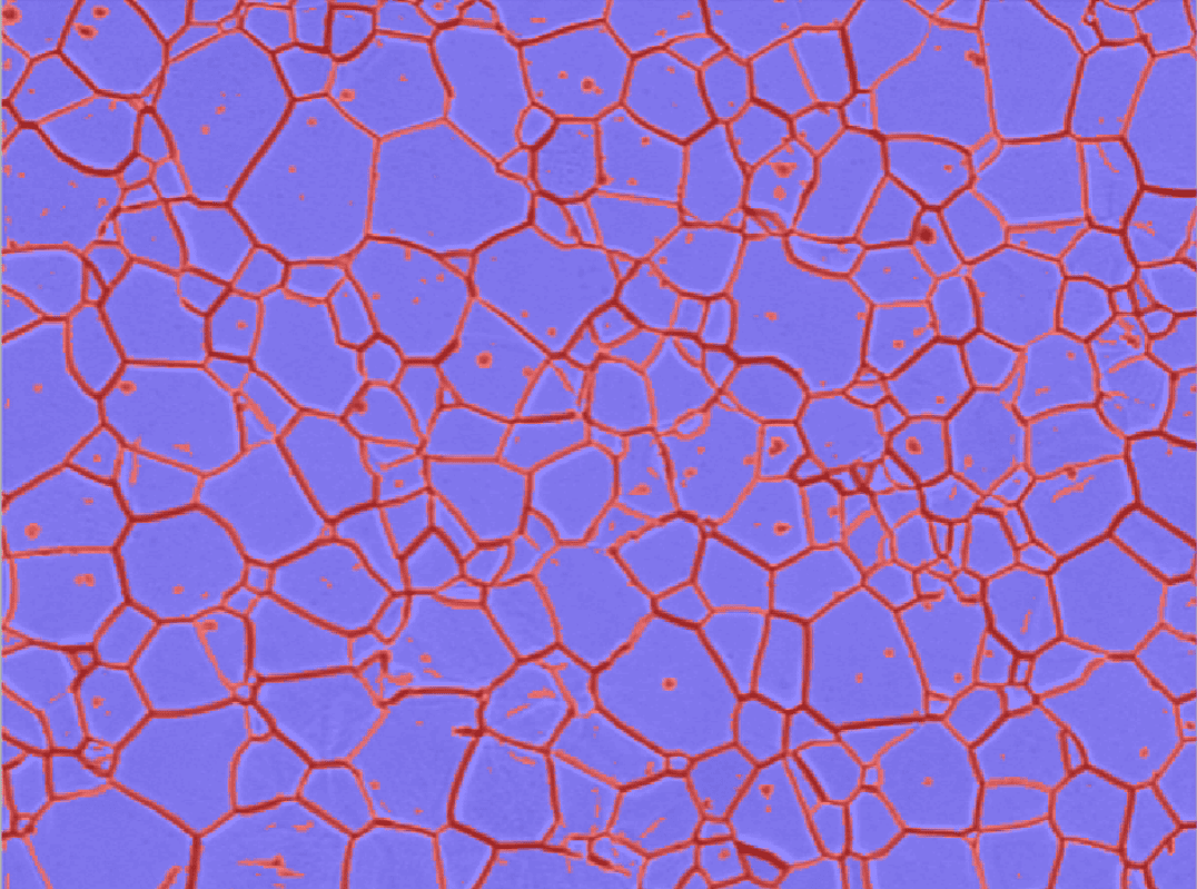Le flux de travail d’annotation de Clemex Studio est intuitif. Prenons l’ image d’un échantillon de titane poli par électrolyse montrant des grains clairs avec des contours sombres. La majorité de la matrice et de la limite peut être annotée facilement avec seulement deux annotations. Une fois terminées, les annotations peuvent être renforcées en mettant en évidence les caractéristiques près de la région d’interaction de phase (limite de phase). La matrice et la limite de phase peuvent être détectées avec précision avec seulement quatre annotations supplémentaires, puisque les algorithmes identifient les composants par pixels de couleur et que la majeure partie de la transition de couleur se produit aux limites de phase.