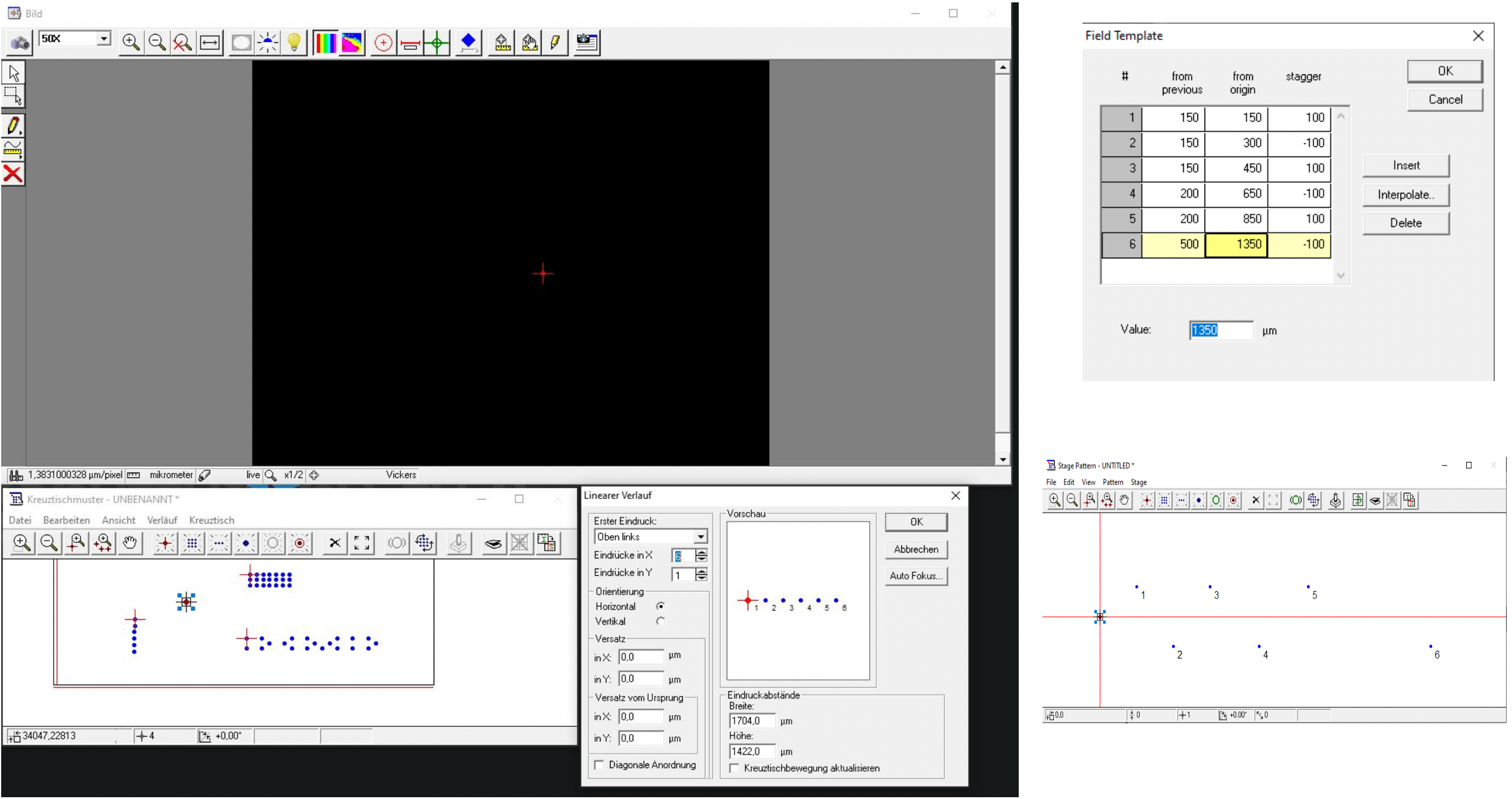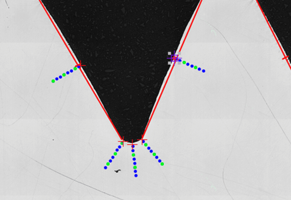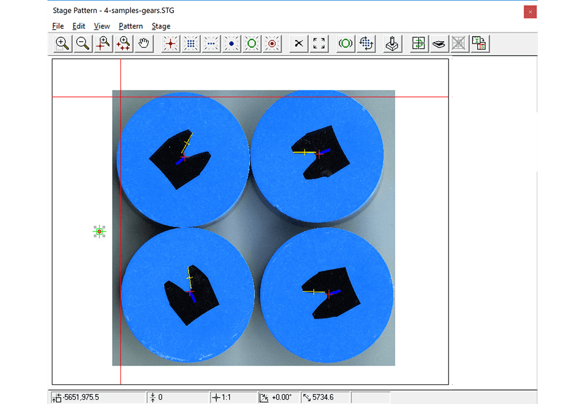 Créez des traverses de dureté automatiquement à l’aide d’un aperçu de l’arrière-plan de l’échantillon, d’un outil de barre en T pour un alignement perpendiculaire des points d’essai avec la surface de l’échantillon et d’options d’espacement et de décalage des indentations.