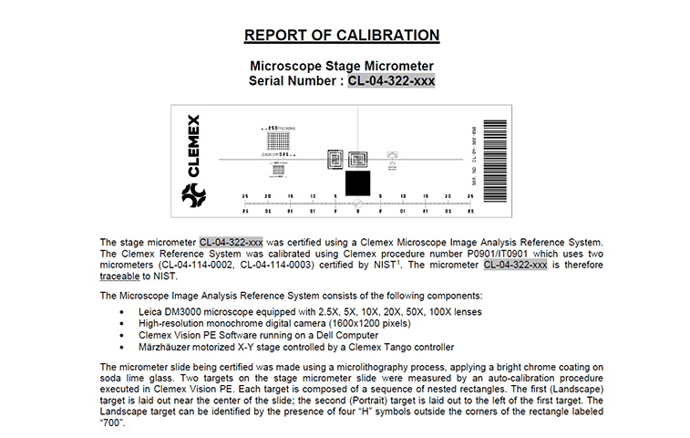 Le calibrage de chaque micromètre de platine est effectué à l’aide d’un système Clemex calibré NIST, qui peut être tracé à la référence de calibrage NIST. Nos micromètres sérialisés sont soigneusement calibrés et sont accompagnés d’un rapport de calibrage électronique ou papier émis par Clemex.